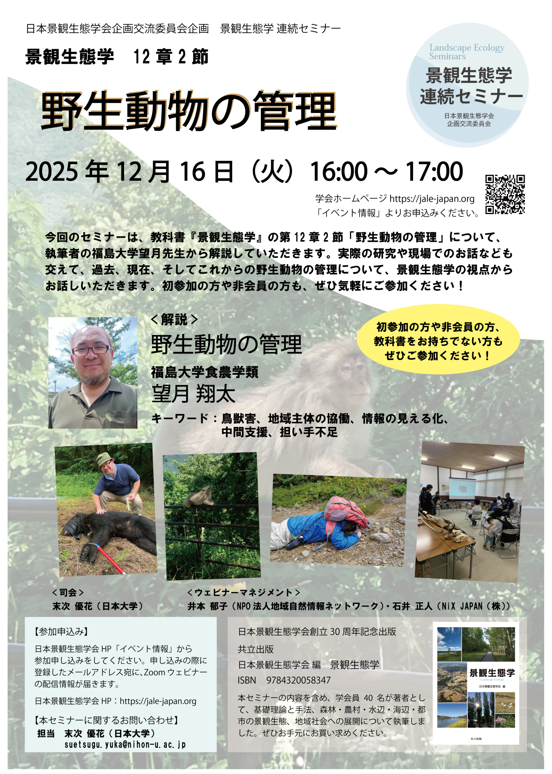 今回のセミナーは、教科書『景観生態学』の第12章2節「野生動物の管理」について、執筆者の福島大学望月先生から解説していただきます。実際の研究や現場でのお話なども交えて、過去、現在、そしてこれからの野生動物の管理について、景観生態学の視点からお話しいただきます。